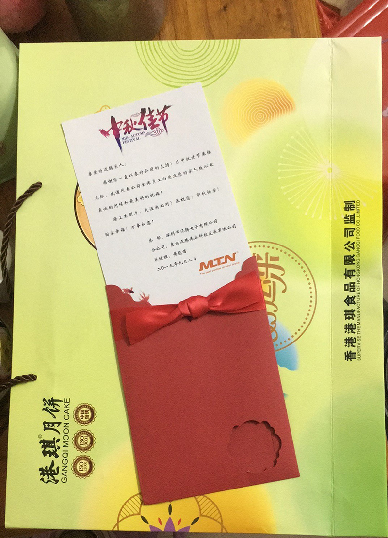 中秋佳節(jié)來臨之際,邁騰電子集團及子公司為全國各地的邁騰家人寄送月餅及精美賀卡,為家人送上濃濃的中秋祝福和滿滿的愛意。